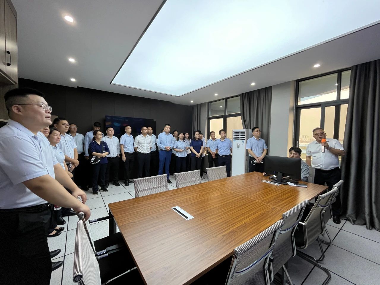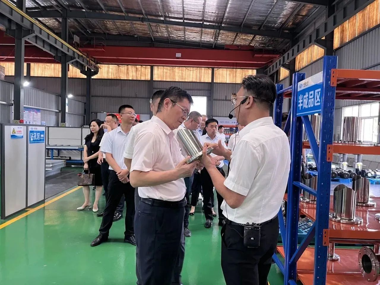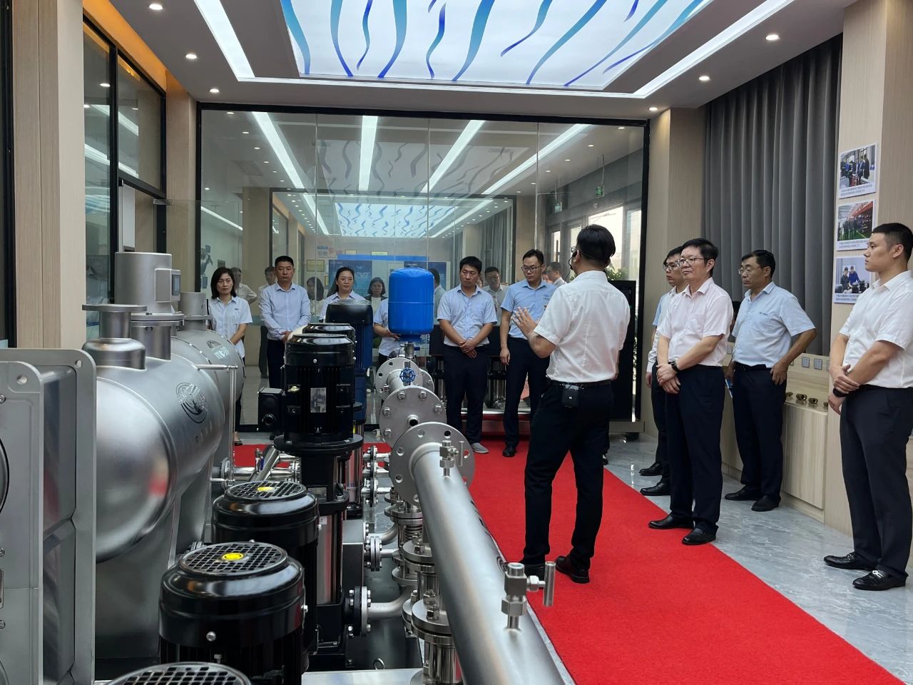 集團郭總在我司講解團的陪同下,帶領(lǐng)集團年輕干部培訓班成員先后參觀了我司機械、電氣生產(chǎn)車間、成品庫、二次供水設(shè)備展廳、二次供水監(jiān)控管理平臺及數(shù)字化智慧水務(wù)平臺。